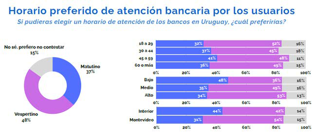 Para analizar este aspecto, AEBU realizó una investigación a través de la Usina de Percepción Ciudadana, buscando conocer la visión de los clientes sobre el cambio. Los resultados son claros en establecer que la mayoría de ellos prefiere el horario vespertino, siendo las personas mayores y las más jóvenes, aquellos de los sectores económicos medios y altos y los residentes de Montevideo, quienes prefieren de manera ampliamente mayoritaria el horario de la tarde.