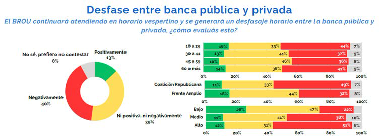 Cuando se consulta a los clientes de los bancos su opinión sobre el funcionamiento de las instituciones en diferentes horarios, la visión crítica aumenta. Mientras solo el 13% lo considera positivo, 4 de cada 10 clientes evalúa negativamente el desfasaje entre la banca pública y la privada, consideración muy superior en los niveles económicos medio y alto, que son quienes habitualmente utilizan más de una institución.