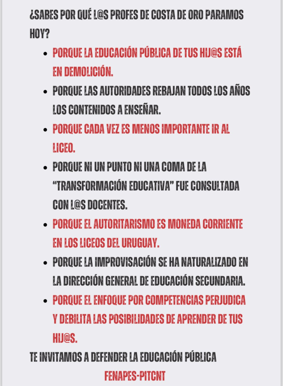 Por otro lado, el sindicato de los profesores de los liceos públicos de la Costa de Oro denunciaron que la educación pública está en “demolición, porque las autoridades rebajan todos los años los contenidos a enseñar, porque cada vez menos importa ir al lico, porque ni un punto ni una coma de la transformación educativa fue consultada con los docentes, porque el autoritarismo es moneda corriente en los liceos del Uruguay, y porque la improvisación se ha naturalizado en la Dirección General de Educación Secundaria”. FENAPES – Canelones denunció, también, que “el enfoque por competencias perjudica y debilita las posibilidades de aprender de los alumnos”.