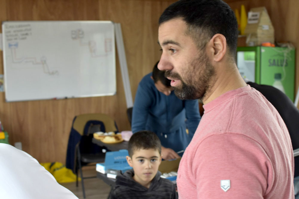 Fernando Gómez, fue docente de la UTU, trabaja hace tres años en la UTE y lleva el mismo tiempo como militante de AUTE. Él brinda sus clases a jóvenes de la Comuna Bella Italia observando cada detalle y le pregunta a los jóvenes los motivos de sus decisiones en el taller.