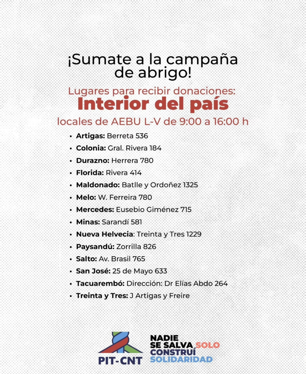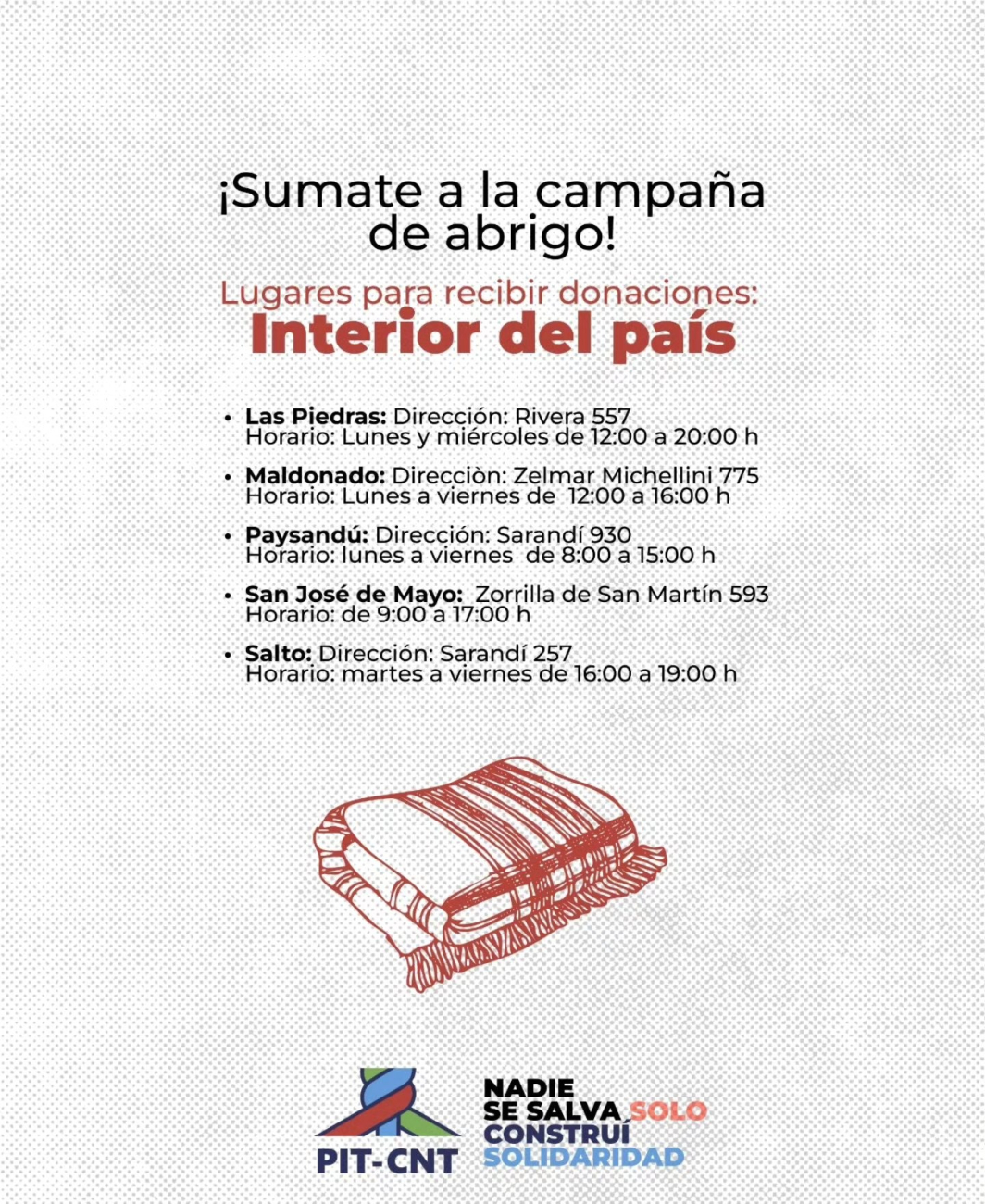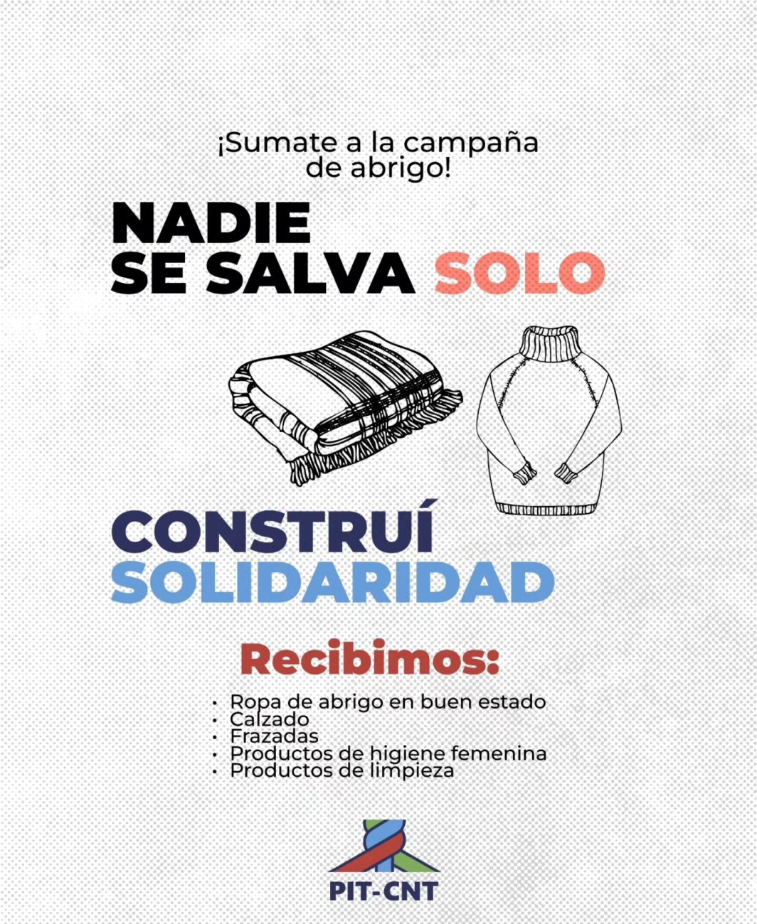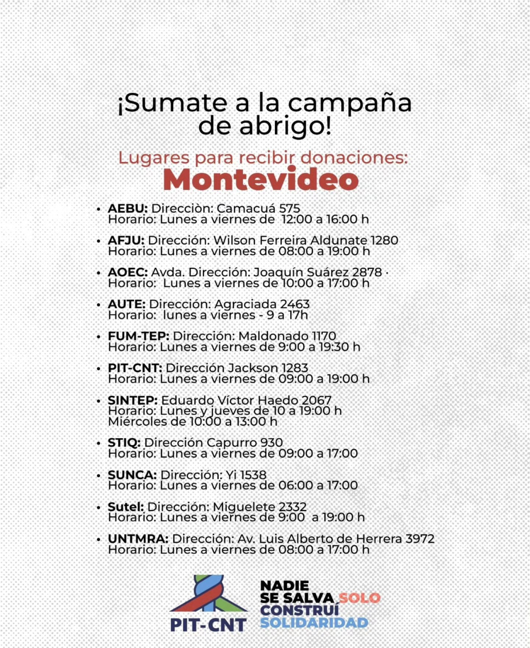 Ante la emergencia climática y el aumento de muertes de personas en situación de calle, el PIT-CNT puso en marcha la campaña solidaria del abrigo bajo el lema “Nadie se salva solo, construí solidaridad”.