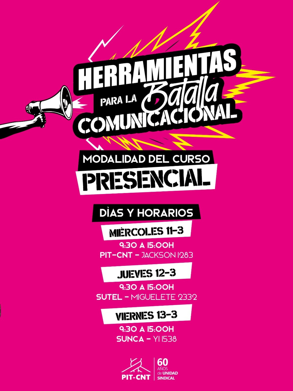 Los días 11, 12 y 13 de marzo, el PIT-CNT llevará a cabo el segundo curso de formación en propaganda y comunicación, bajo la premisa "Herramientas para la batalla comunicacional". Será un curso teórico práctico que tendrá distintos módulos y contará con la presencia del escritor, docente, lingüista e investigador chileno, Pedro Santander, como invitado especial.