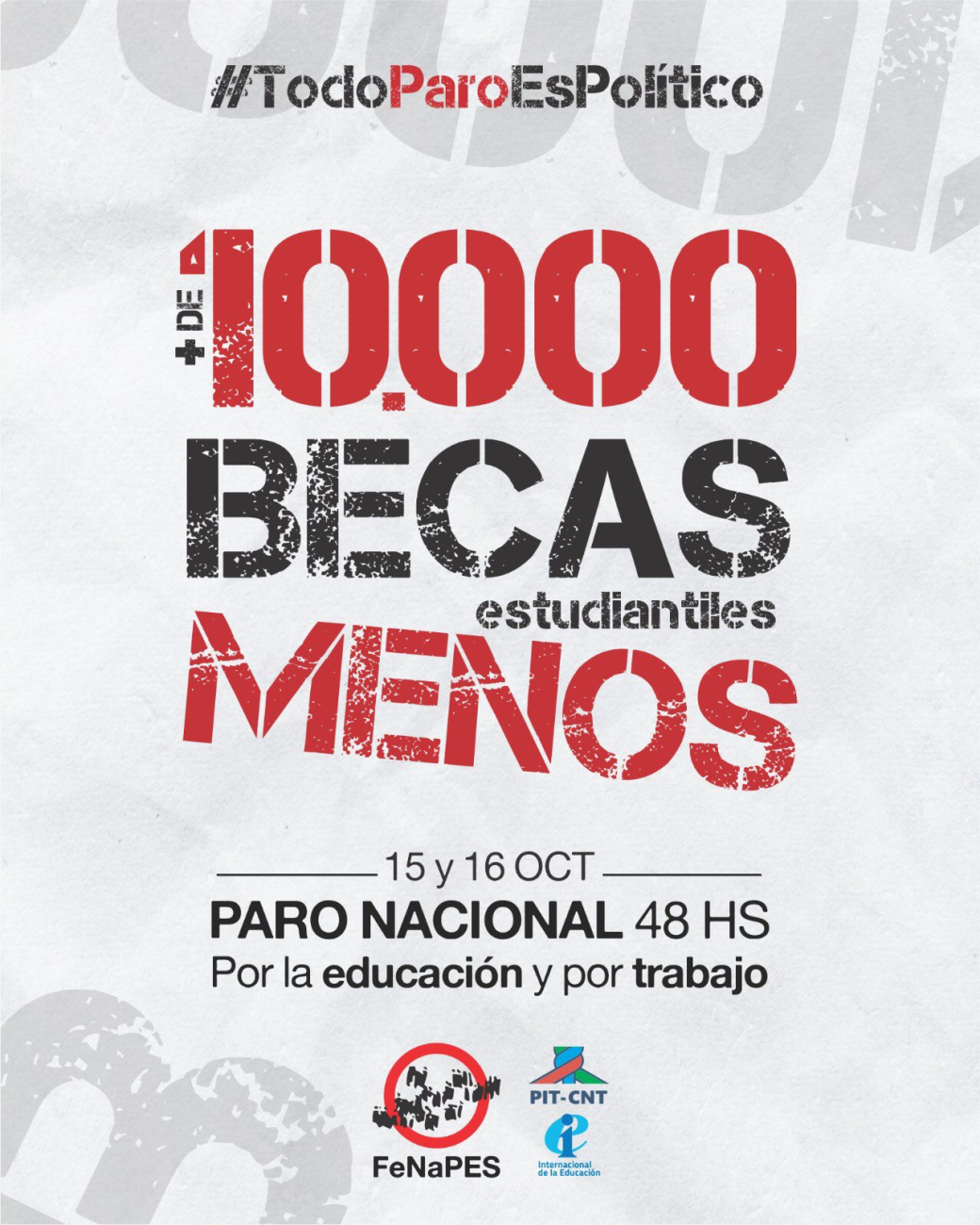 La Federación Nacional de Profesores de Enseñanza Secundaria (FENAPES) realizará un paro nacional de 48 horas los días martes 15 y miércoles 16, en protesta contra la reforma educativa, el modelo de desigualdad y en defensa del empleo. A la suspensión de actividades del día 16 se suma una concentración a las 9:30 en el Monumento al Gaucho, seguida de una movilización por 18 de Julio hasta la calle Andes, donde se llevará a cabo un acto.