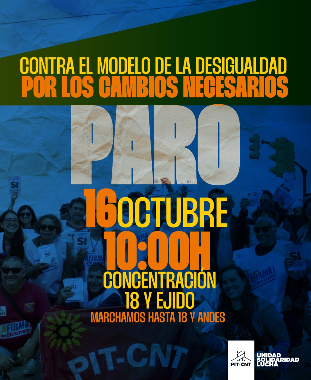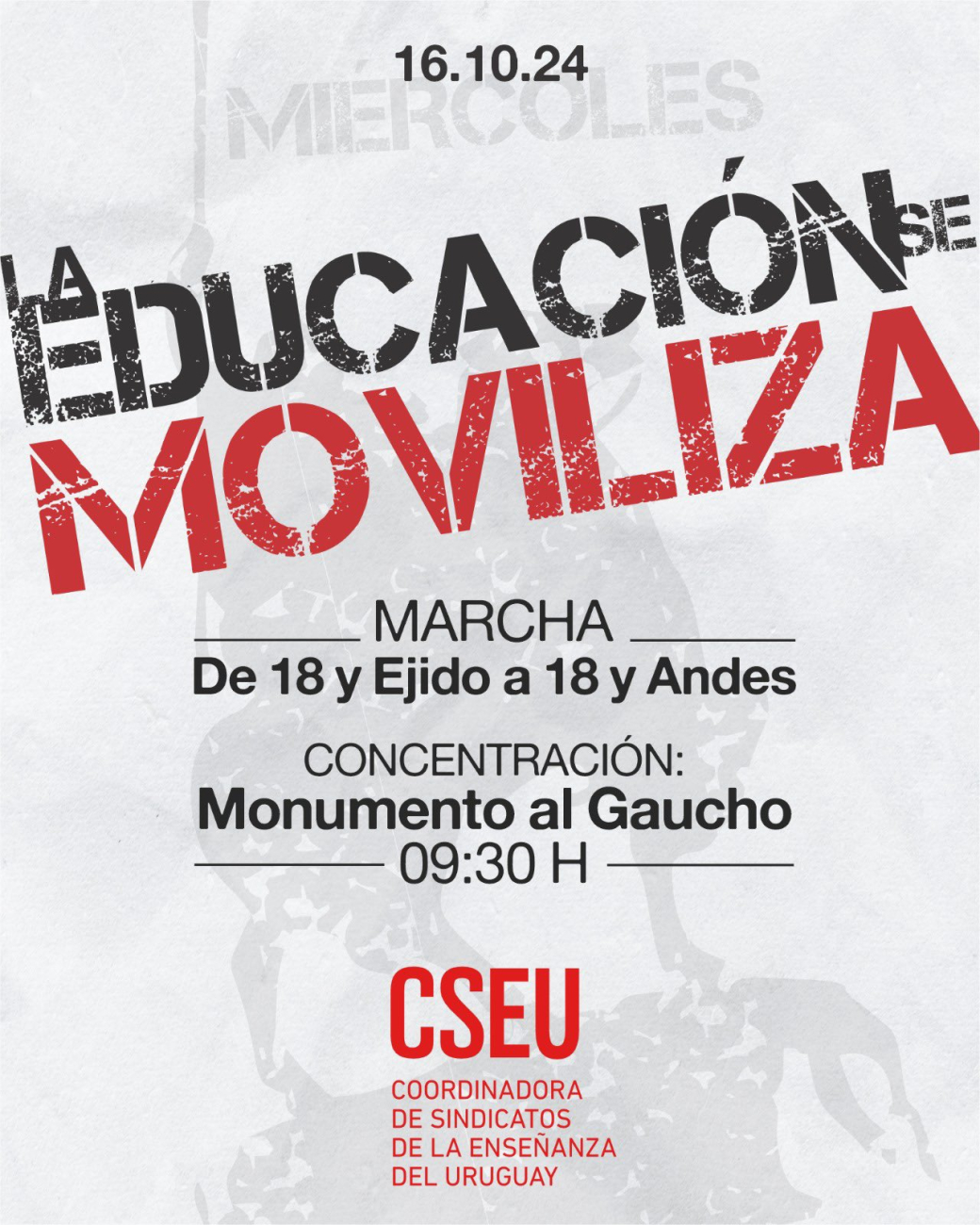 Al paro del día miércoles 16 se suma una concentración a las 9:30 en el Monumento al Gaucho, seguida de una movilización por 18 de Julio hasta la calle Andes, donde se llevará a cabo un acto al que convoca la Coordinadora de Sindicatos de la Enseñanza del Uruguay. En dicho acto harán uso de la palabra José Olivera, presidente de FENAPES; Nathalie Barbé, secretaria general de la Asociación de Trabajadores de la Seguridad Social de Montevideo (ATSS); y Enrique Méndez, dirigente de la Federación de Trabajadores de la Industria Láctea (FTIL) y secretario de Organización del PIT-CNT.